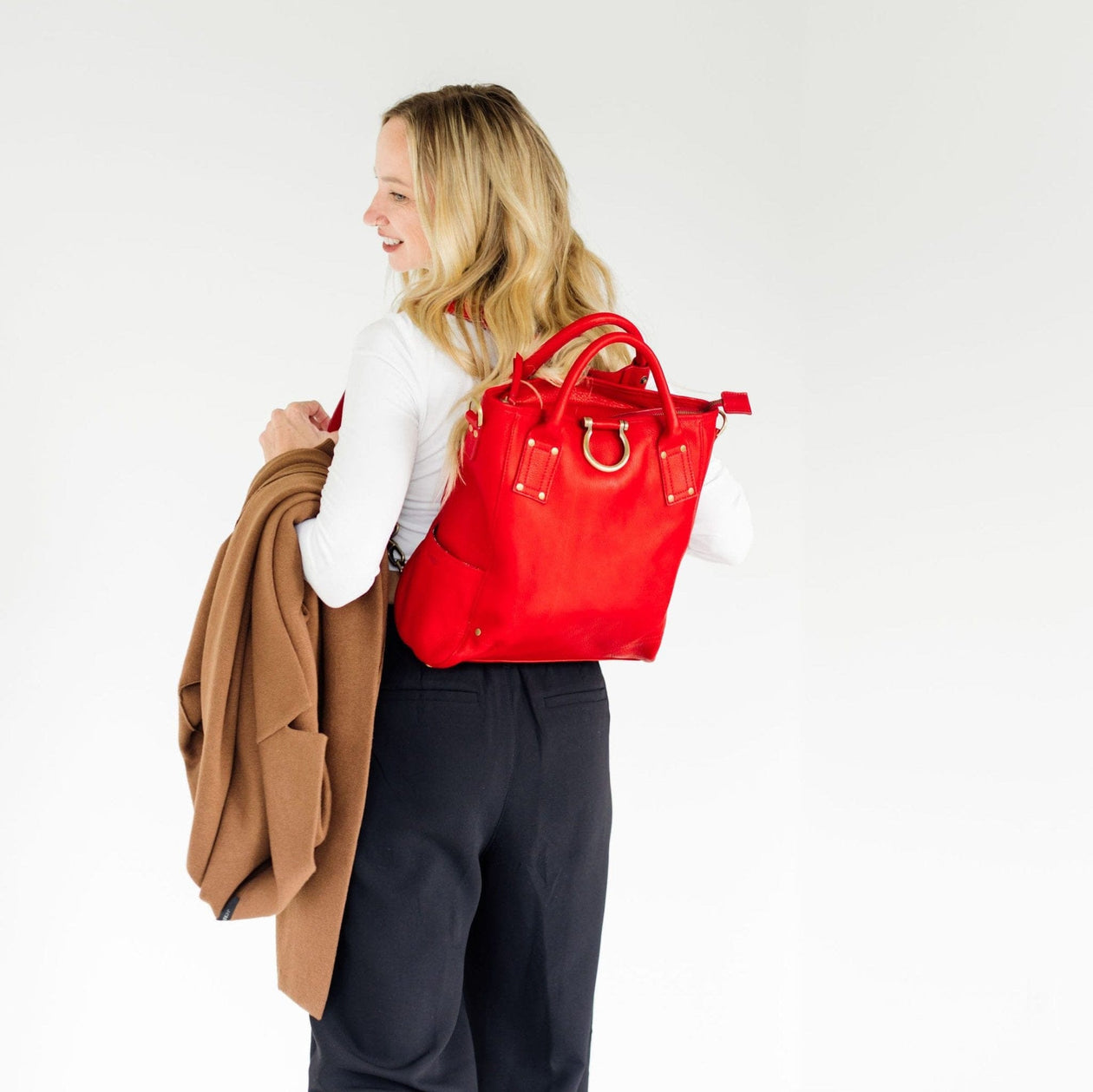 The Natasha bag is the epitome of versatility. Wear it as a backpack, carry it by the top handle, or upgrade with a crossbody strap. It features ample interior storage, two exterior magnet pockets, an exterior zip pocket, and a suitcase handle sleeve that converts to a pocket when not in use. Ideal for work trips or weekend getaways.
