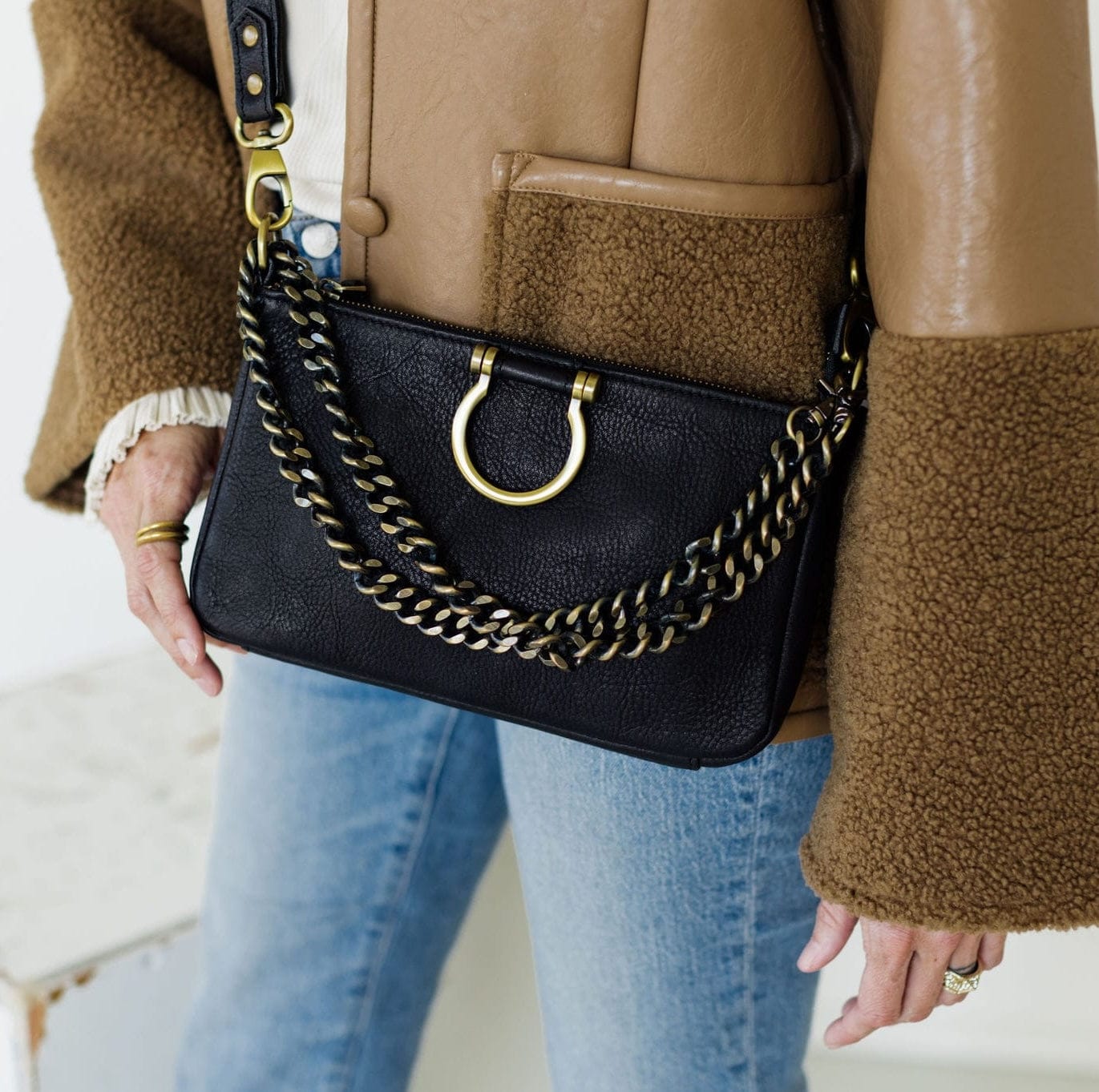 6 ways to wear this combo: Crossbody, crossbody using chain strap, shoulder bag, shoulder bag using doubled over chain strap, clutch, or use the chain as a decorative element.